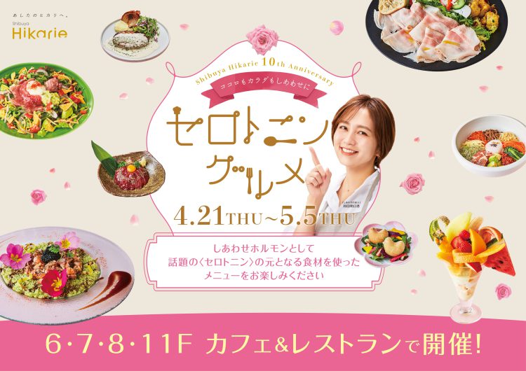 4月21日(木)~5月5日(木・祝)の期間、渋谷ヒカリエ6F・7F・8F・11Fのカフェ&レストランで、渋谷ヒカリエ10周年のテーマ「BLOOM YOUR HAPPINESS.」にちなんだ、“しあわせホルモン”として話題の脳内物質「セロトニン」の元となる食材を使ったメニューを提供する飲食フェアを開催します。