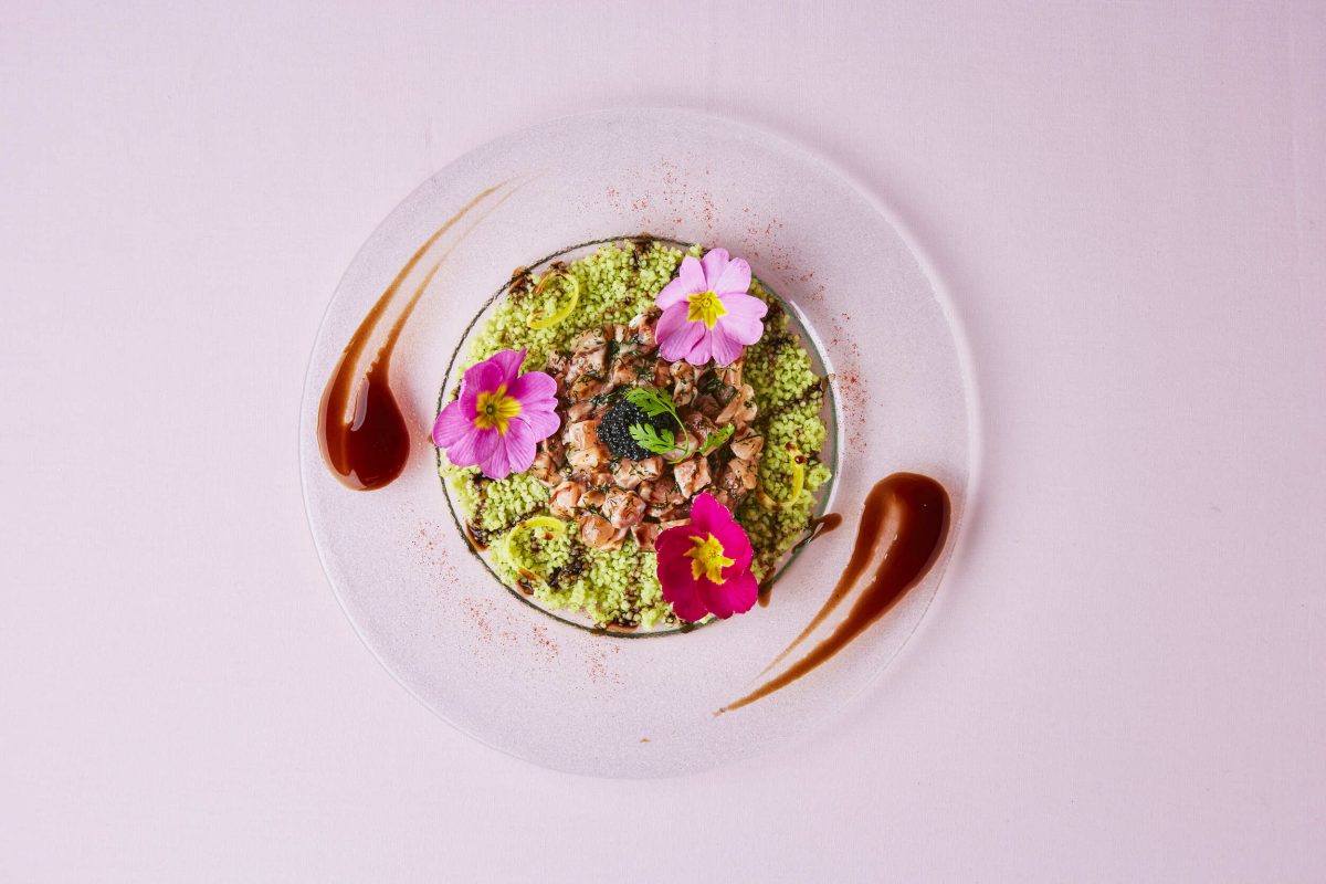 <サーモンとクスクスのサラダ風 ~黒いダイヤのせ~>は、緑色のクスクスにサーモンの赤身とさらに食用の花、キャビアに似たランプフィッシュキャビアをのせ、色鮮やかにサラダ風に仕上げた春らしい一皿です。