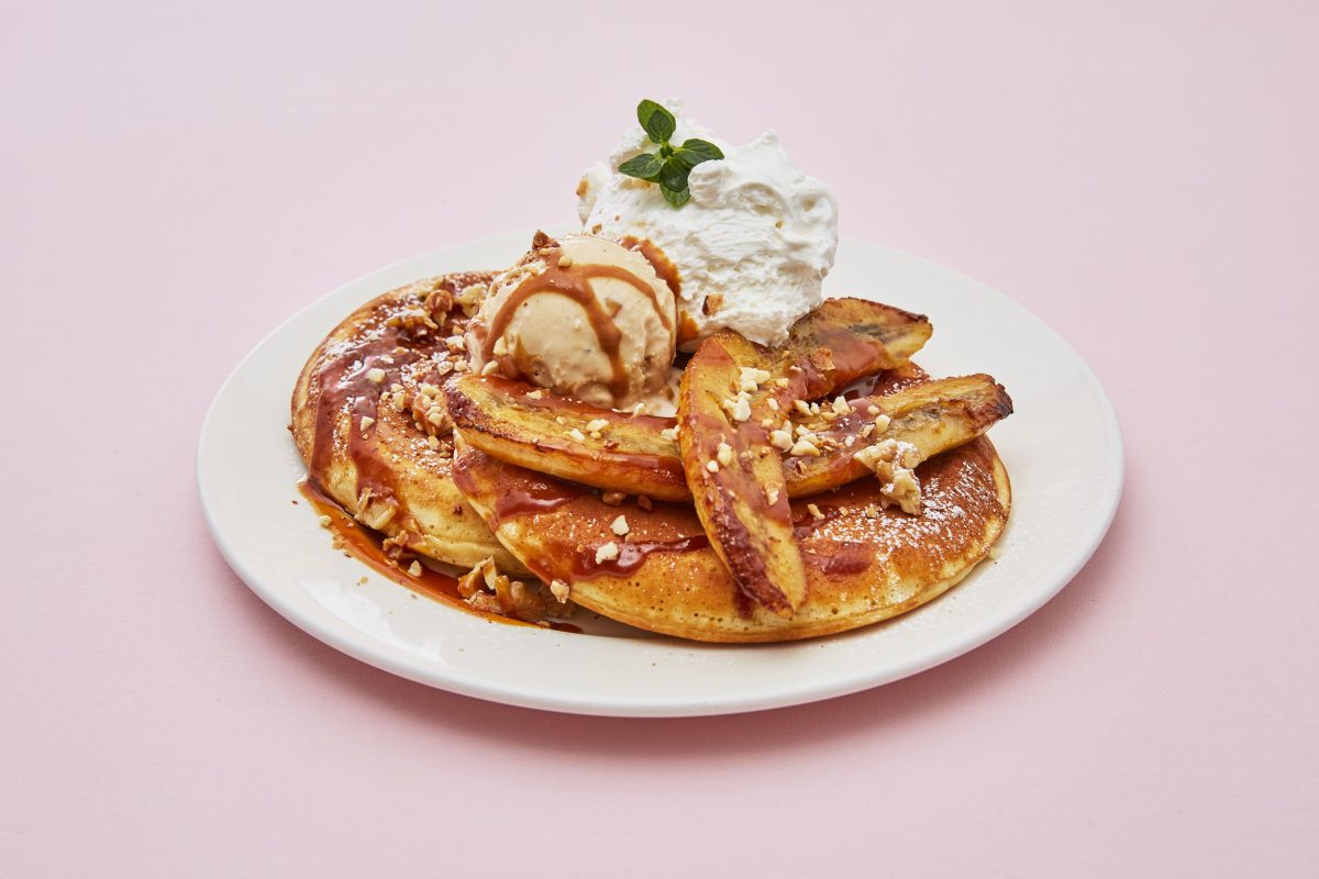 <キャラメルバナナナッツパンケーキ>は、バナナを丸ごとキャラメリゼして、ナッツとキャラメルソースと合わせました。バナナとキャラメルの甘いハーモニーをふわふわパンケーキと一緒にお楽しみください。
