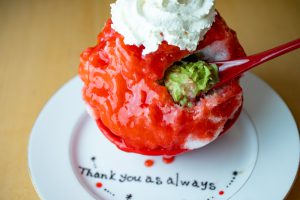 「伊勢のおもてなし」をテーマに、三重県で明治時代より続く老舗甘味屋が、伊勢名物でもてなす1軒。この店のオーナーで、スイーツコンサルタントとしても活躍する井端久泰さんが考案したのが「苺の純生クリーム氷」。イチゴのショートケーキをイメージしたかき氷で、コク、酸味、甘みが一体となった立体的な味わいが楽しめる。メッセージを書き込んだスペシャルデザートプレートにすれば、さらに特別感アップ。大切な人へのサプライズだけでなく、自分へのご褒美にも!