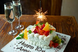 タパスからパエリャまで、新鮮な魚介類を使用した本格的なスペイン料理に定評があるレストラン。渋谷の街並みを見下ろす優雅な店内は非日常感たっぷりで、大切な人との記念日デートに利用する人が多い。そんな貴重な時間をスペシャルに演出してくれるのが「ホールケーキプレート」。2~4名分あるホールケーキは、お店のパティシエの手作り。ケーキの内容は日によって異なるが、ふわふわのスポンジと軽やかな甘さの生クリームを合わせ、旬のフルーツでデコレーションされた豪華版!