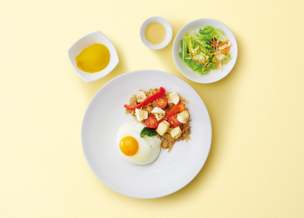 今回の<チーズガパオ>は、定番のガパオライスをアレンジした今だけのオリジナルメニュー。トッピングされた、なめらかな食感のチーズ「大地のほっぺミニ(チーズ工房NEEDS)」とフレッシュトマトによって、コクと旨味がさらにアップ。その味は定番とは違ってとてもまろやかです。