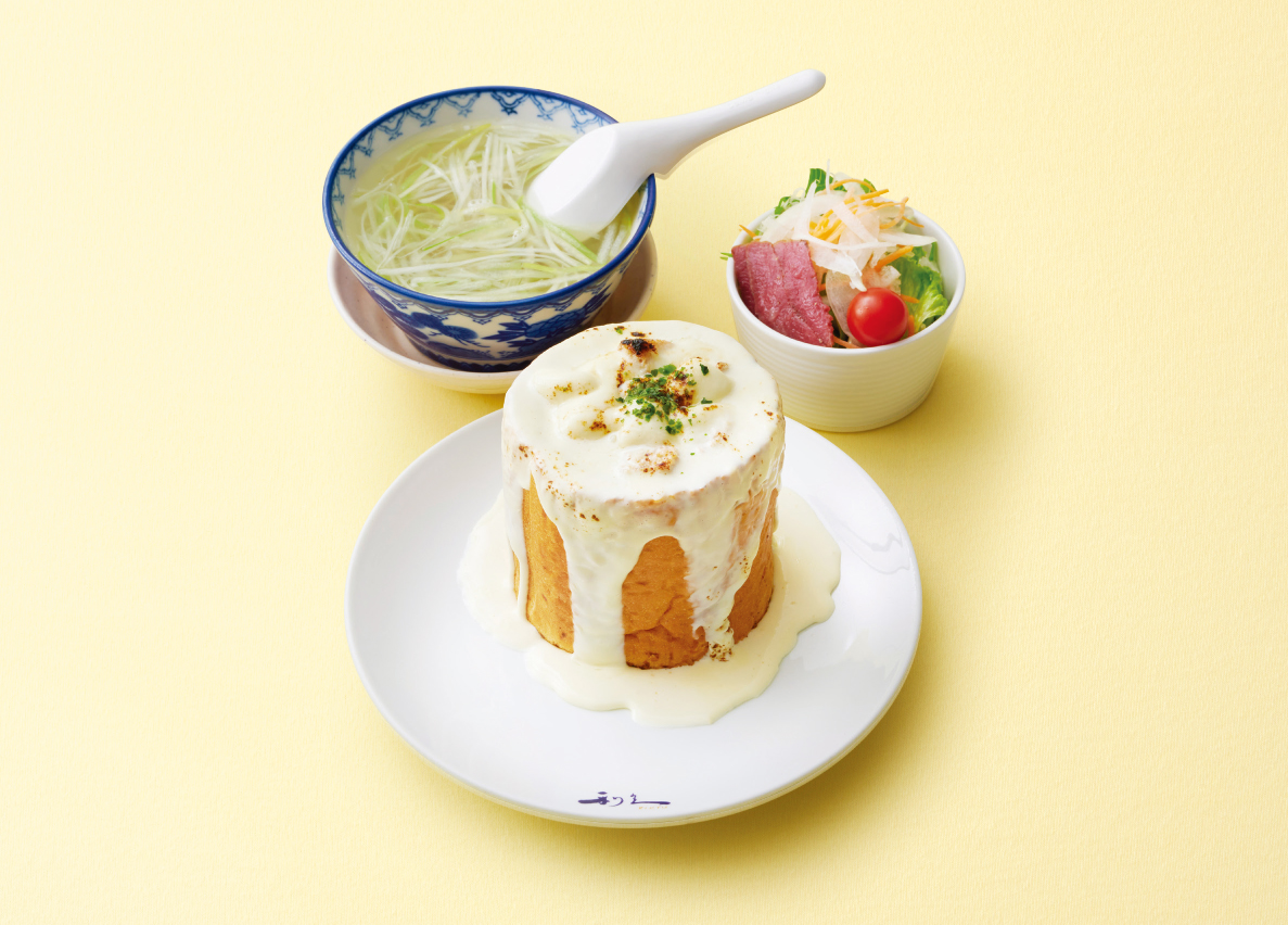 <牛たん入りカレーの入ったとろとろチーズパンセット>は、パンの中に牛たんカレーを詰め、その上からチーズソースをたっぷりと。さらにクリーミーなモッツァレラチーズ「モッツァレラミニ(ニセコ髙橋牧場)」をのせて、軽く焦げ目をつけた食べ応えのある一品です。