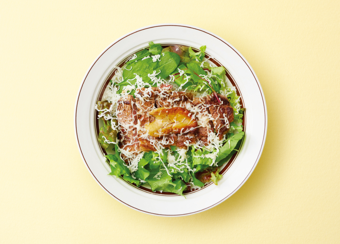 <フォアグラステーキ丼 ~山わさびチーズ仕立て~>は、ステーキの上にフォアグラがのった贅沢な丼です。濃厚&ジューシーな味をグッと引き立てるのが、山わさびチーズ「COW’S KITCHEN(長沼あいす)」。ピリッとした爽やかな辛さが食欲をそそる、ディナータイム限定のメニューです。