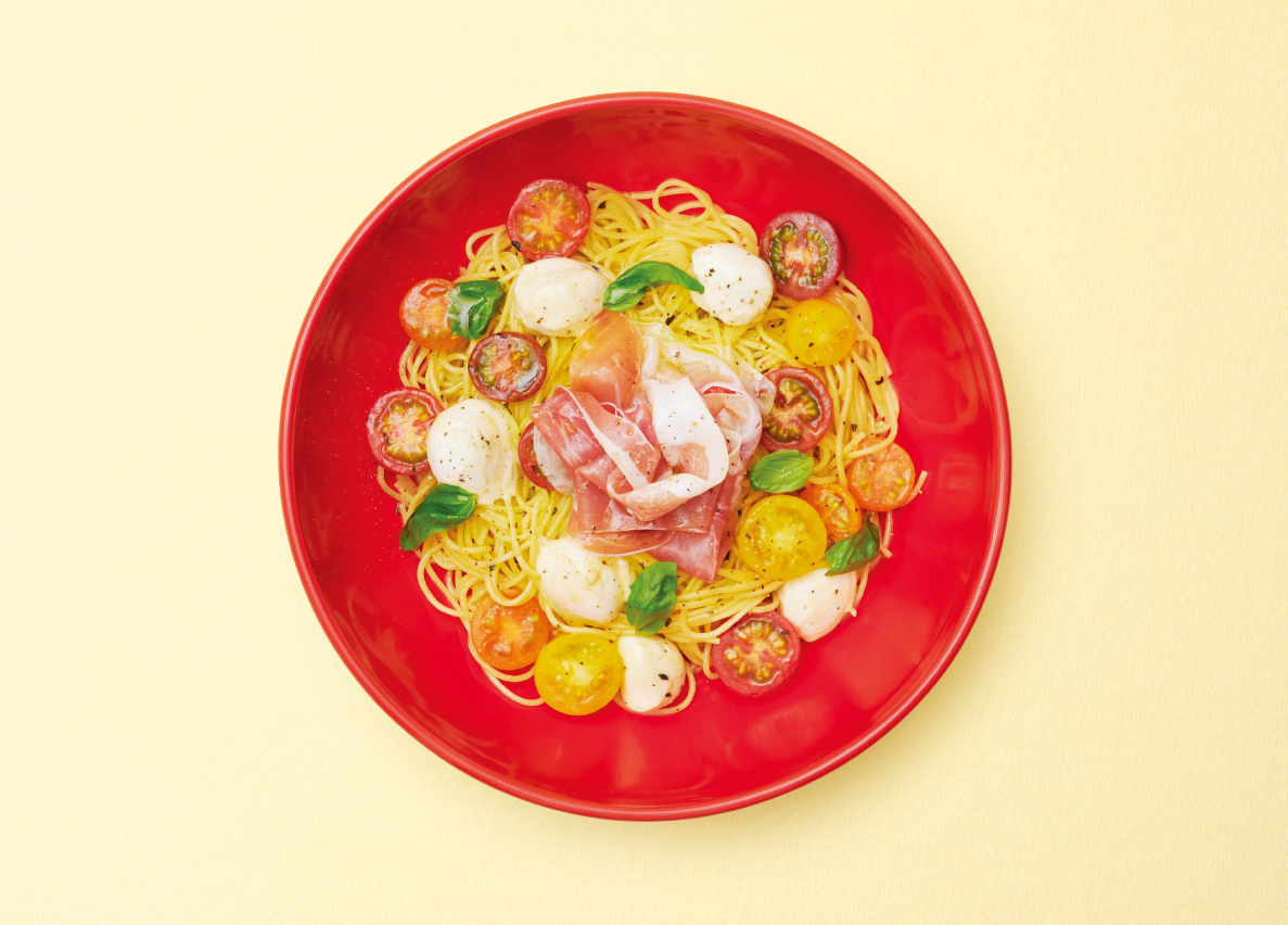 【1日限定20食】北海道産ニセコ髙橋牧場のモッツァレラチーズとカラフルトマトと生ハムのペペロンチーノ