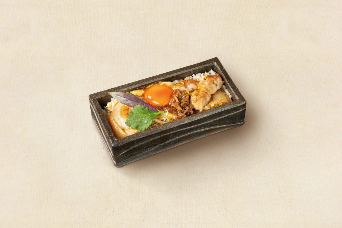 作中登場の「コカトリス(尾蛇類)」が表現された比内地鶏と、極濃厚たまごが一緒になった親子丼です。鶏出汁で炊いた麦飯はおこげがついていて、香ばしさも楽しめます。