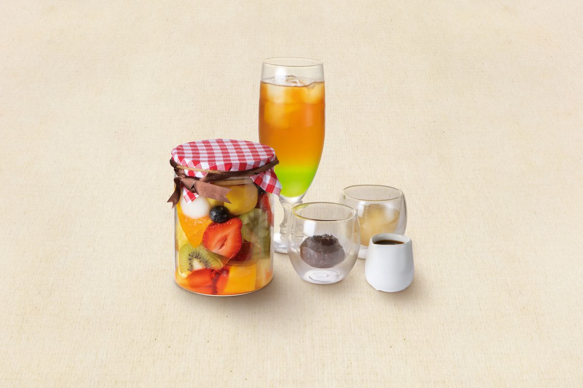 盛り沢山のフルーツとカットされた寒天が美しく、つい見とれてしまいます。セットのドリンクと合わせて楽しんで。