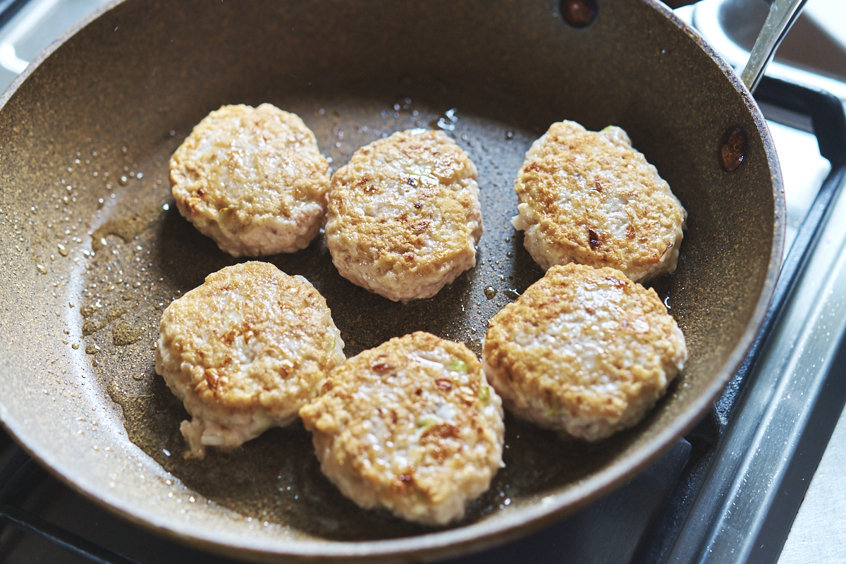 3.フライパンにサラダ油を中火で熱し、2のつくねを並べ入れる。焼き目がついたら裏返しをし、フタをして2~3分焼く。器に盛り、からし醤油を添えていただく。
