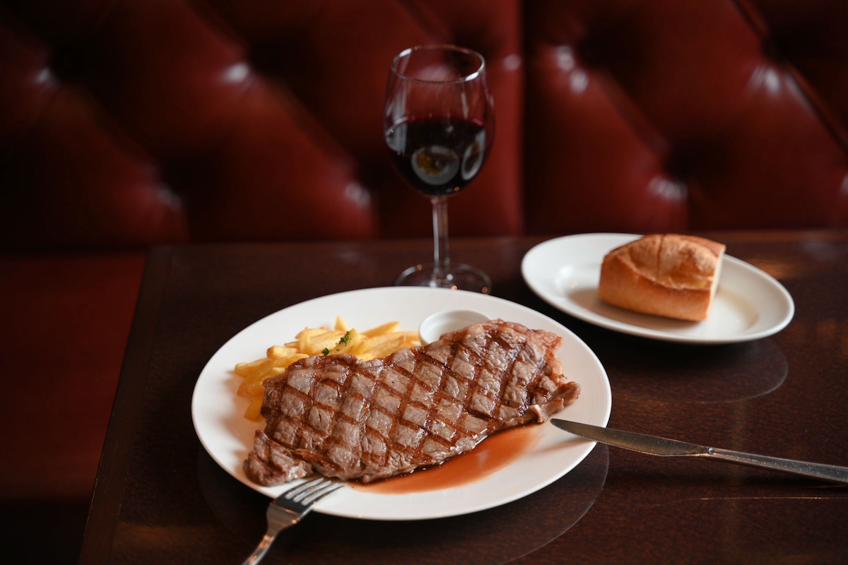 バケット付きの「ステーキフリット」2,900円。「ハウスワイン」グラス550円とも好相性。