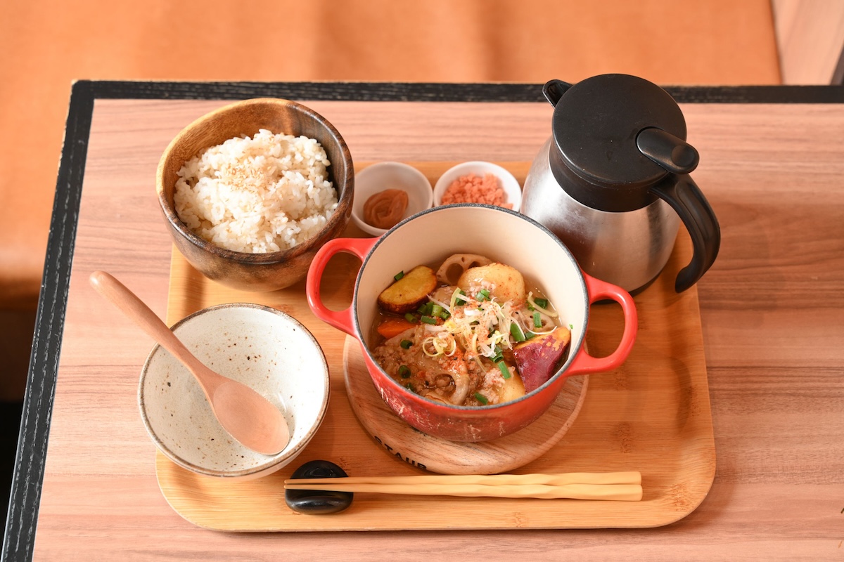 「温野菜の豚旨そぼろあんかけ膳」1,529円。メインのおかず、ごはん、特製お出汁、お茶漬けのトッピング2種がセットに。