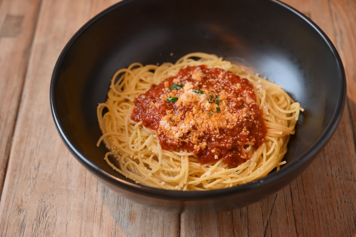 〈すぱじろう〉を代表するオーソドックスな「ミートソースすぱ」1,045円。シンプルな作りながら、一度食べたらハマる人が続出するほど根強いファンが多い。