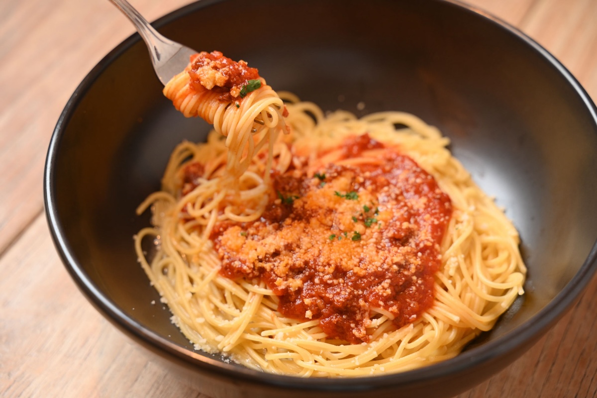 肉々しい濃厚ミートソースがよく絡む、王道メニュー。