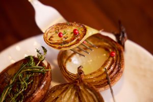 「11~12月の蟹座は、一言でいえばちょっと面倒くさい運勢です。こちらを立てると、あちらが立たず…。誰かのワガママを通すと“私も私も”とキリがなくなりそう。ハーブとオニオンで、交通整理をしっかりと。筋を通せば、案外すんなりこなせます」(章月さん)。〈ワイン食堂 旅する子ブタ〉は、骨太なフランス料理とフランスワインをカジュアルに楽しめるフレンチビストロ。ランチメニューのハンバーグなどの付け合わせとしても提供され、ディナータイム限定でアラカルトとしてオーダーできるのが「ハーブの効いたオニオンロースト」。毎朝届くフレッシュな玉ねぎを丁寧に処理し、3回に分けて火入れするこだわりよう。最後の仕上げの際に、ローズマリーとタイムを加えて焼き、プロヴァンス地方の地中海でとれるミネラル豊富な岩塩で味を調える手の込んだ一皿は、一度食べたらやみつきに。