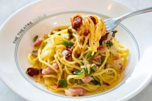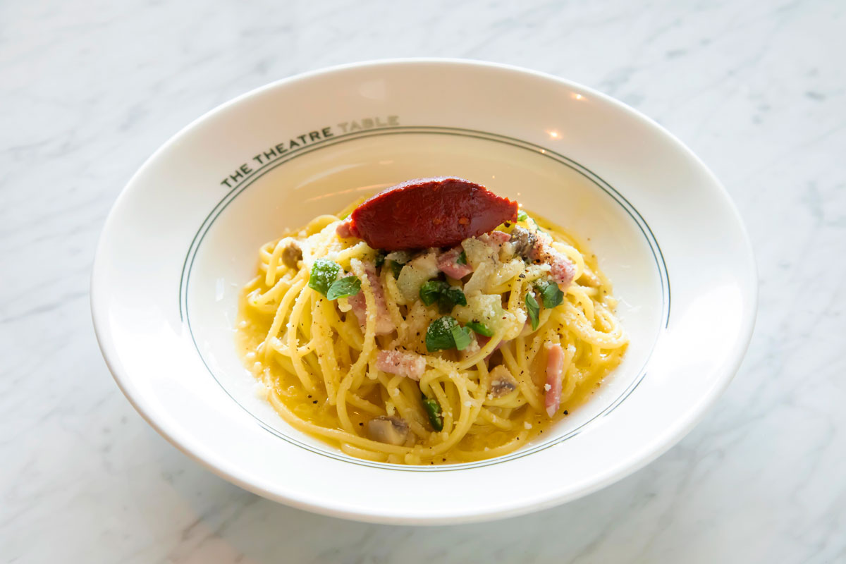 料理も内装も新たに生まれ替わった〈THE THEATRE TABLE〉。15年連続ミシュラン1つ星、”最も予約の取れない”と称される銀座のイタリアンレストラン〈AROMAFRESCA(アロマフレスカ)〉の原田慎次シェフがメニューを監修し、「デリカートナポリタン」は、同フロアにある〈東急シアターオーブ〉にちなんで“ミュージカルの転換のような白から赤への変化”をコンセプトにした新メニュー。中央に鎮座するトマトペーストを混ぜながらナポリタンに仕上げていく演出がユニーク。