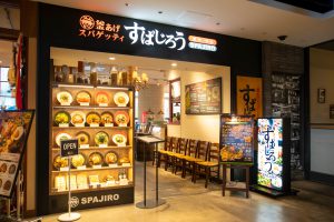 〈すぱじろう〉は、麺のゆで方、食材、味にこだわった釜あげスパゲッティ専門店。たっぷりのお湯で茹でるスパゲッティメニューは、明太子などの和風から、トマトソースなどの洋風まで40種類以上。その中でも「たらことサーモンとねぎのすぱ」は、釜揚げしたスパゲッティに粒々のたらこを絡め、その上にグリルしたサーモンとシャキシャキのねぎ、たっぷりの海苔をトッピング。スパゲッティの麺の量は、追加料金なしで、S、M、Lから好きなサイズを選べるので、その日の気分やお腹の空き具合に合わせて、思う存分に味わって。