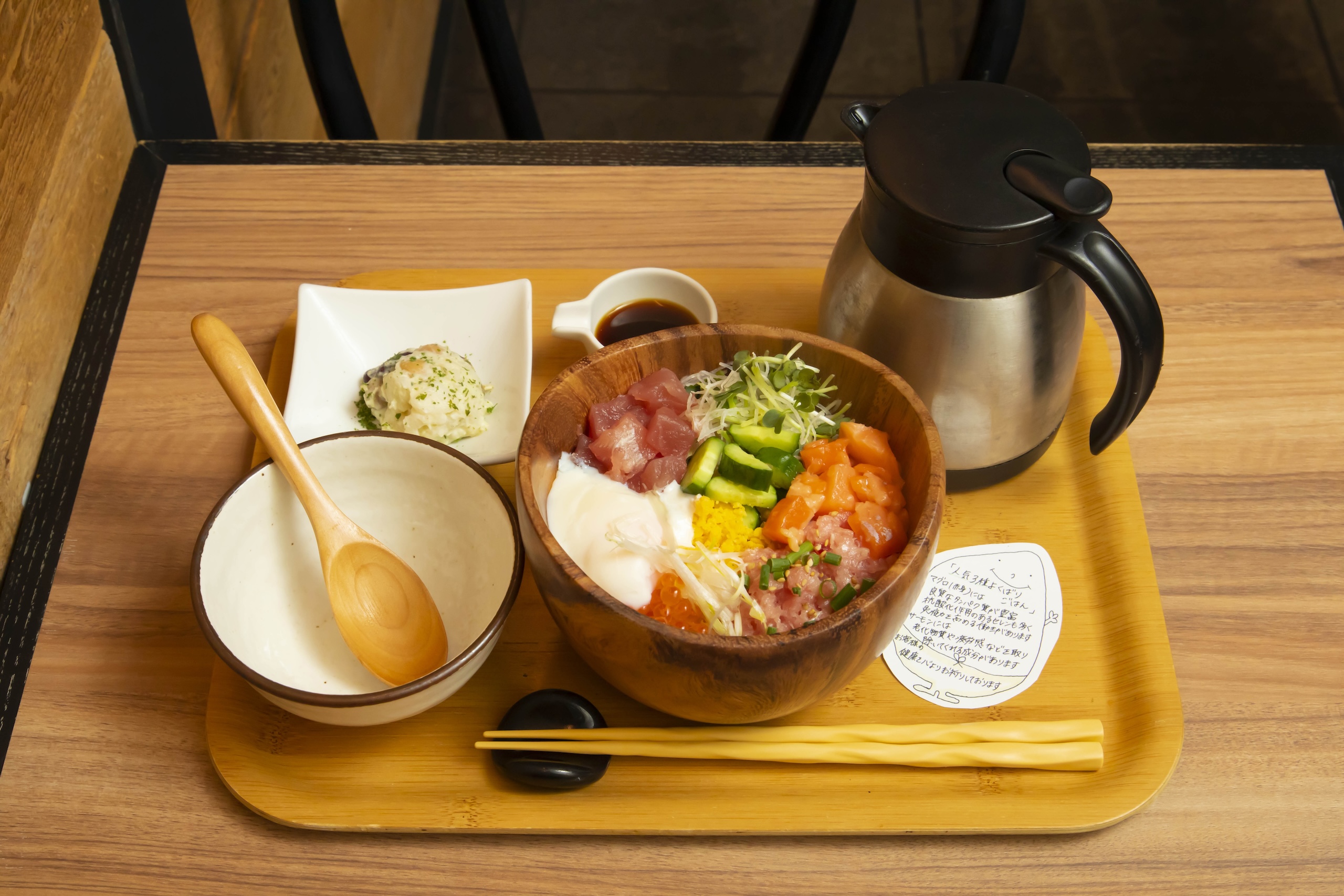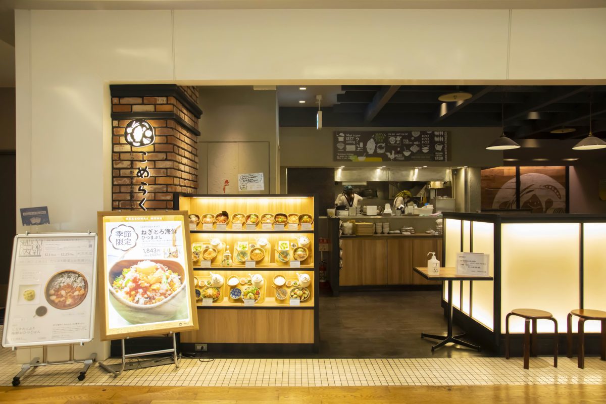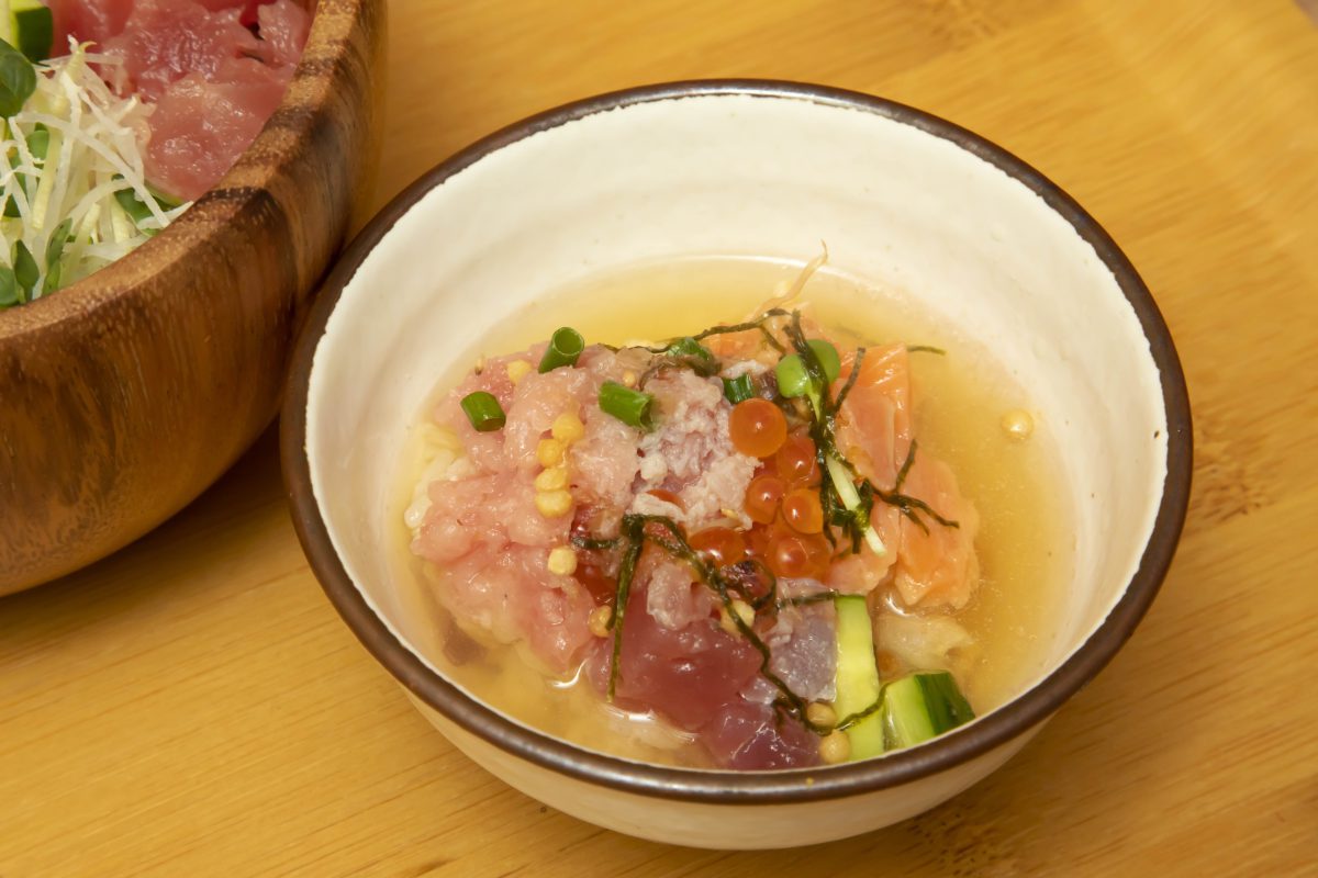 〈こめらく たっぷり野菜とお茶漬けと。〉は、こだわりの特製お出汁が自慢のお茶漬け専門店。「おひつごはん」は、まずは特製ダレや自家製薬味醬油をかけて丼として、次に特性お出汁をかけてお茶漬けとして食べられる、2度美味しい定番メニュー。12種類ある中で、「人気3種のよくばりごはん(サーモン・ねぎとろ・まぐろ)」は、ボリューム満点ながらヘルシーで体が喜ぶ一品。老化物質や疲労感などを取り除いてくれるサーモンと、良質なたんぱく質が豊富で免疫力を高める働きがあるまぐろやねぎとろが、健康や美容の味方となってくれるはず。