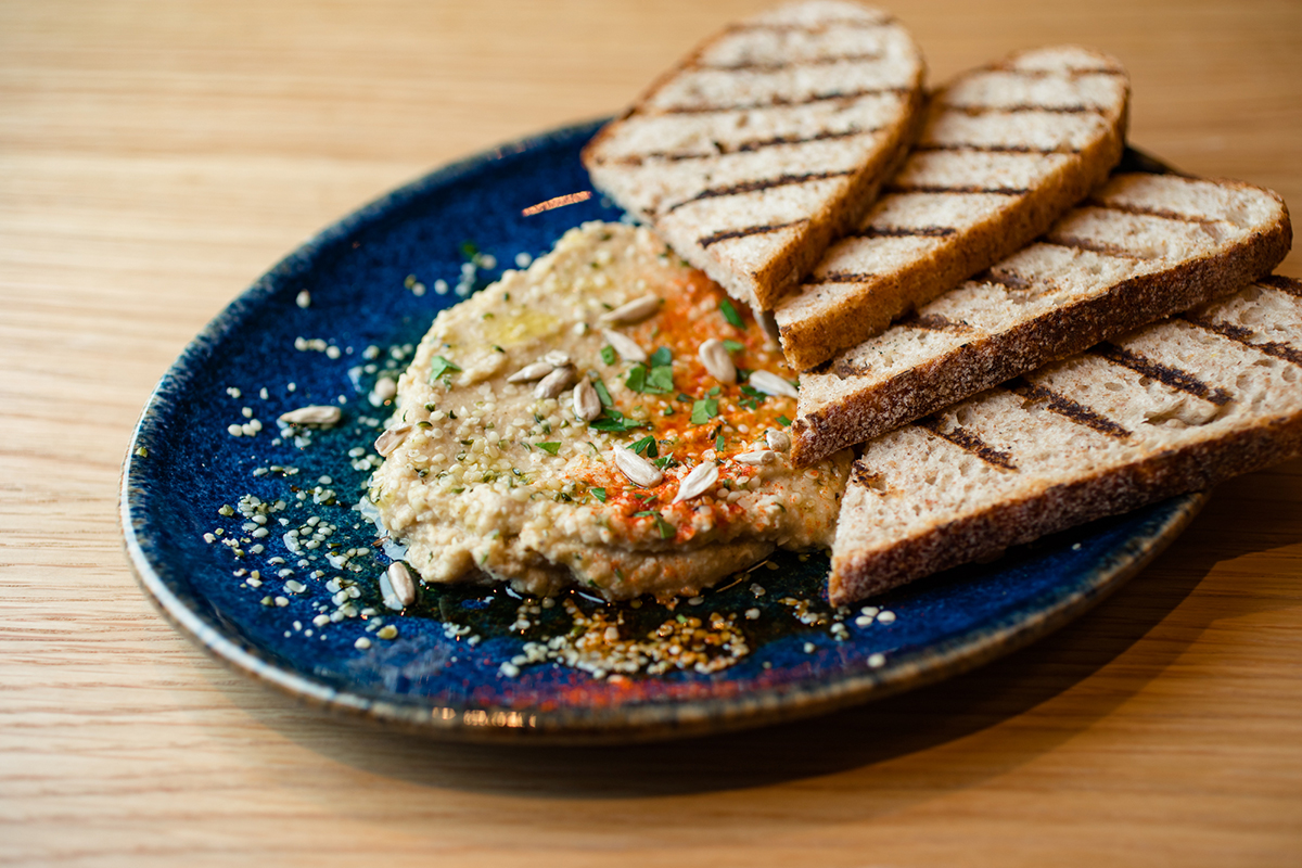 おすすめメニューその1:「季節野菜のフムスと天然酵母カンパーニュ」1,078円