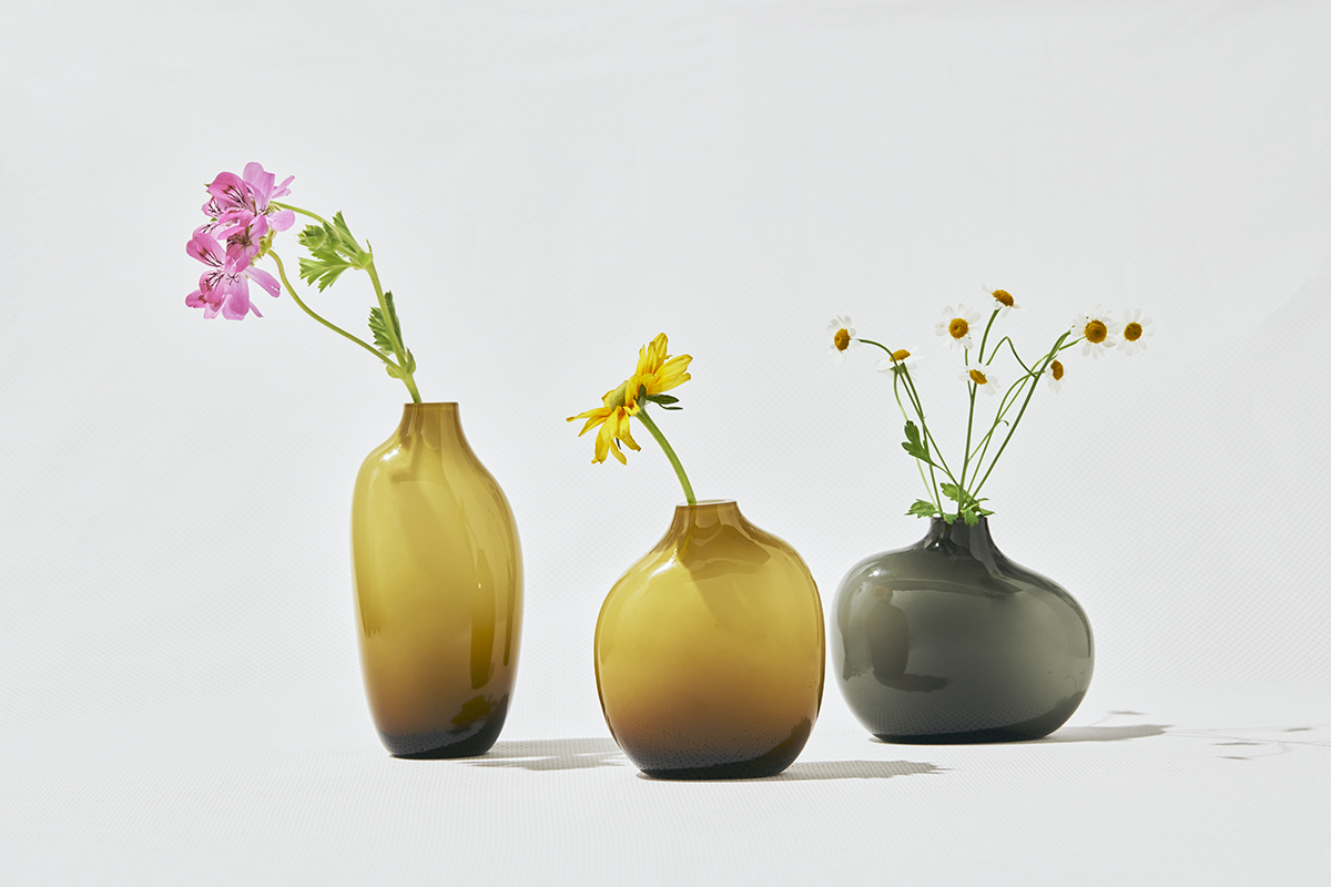 アシンメトリーなフォルムのコンパクトサイズの一輪挿し。「ふっくらと厚みがありプリミティブなボディがかわいい。サイズや色違いのフラワーベースを並べて、それぞれに違う花を生けても楽しい。北欧好きにも喜ばれそう。気軽な値段感もギフトに良いと思います」。マスタード、グレーのほかにブラウンもある。〈コレックス〉渋谷ヒカリエ5Fにて販売中。