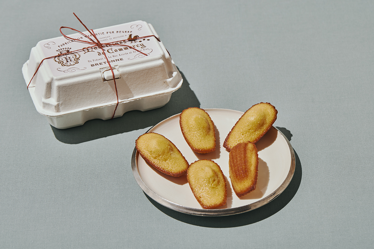 「卵ケース型のパッケージがユニークでギフトらしい装い。おいしそうな焼き色のひと口サイズのマドレーヌは、ブレイクタイムのお供にぴったりだと思います」。しっとり食感のプティ・マドレーヌは、バターとバニラの風味がゆたかで、レモンの香りとハチミツの甘みに包まれる。〈ビスキュイテリエ ブルトンヌ〉渋谷ヒカリエB2で販売中。