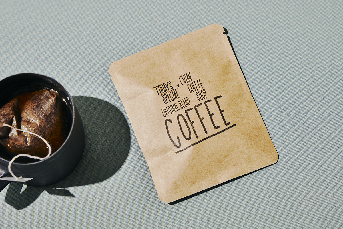 〈トゥデイズスペシャル〉と神戸・芦屋の老舗コーヒーショップがコラボして生まれた、オリジナルコーヒーバッグ。カップに入れてお湯を注げばOK。「限られた時間とスペースのオフィスで、手間いらずでおいしいコーヒーを淹れることができます。」〈トゥデイズスペシャル〉渋谷ヒカリエ4Fで販売中。