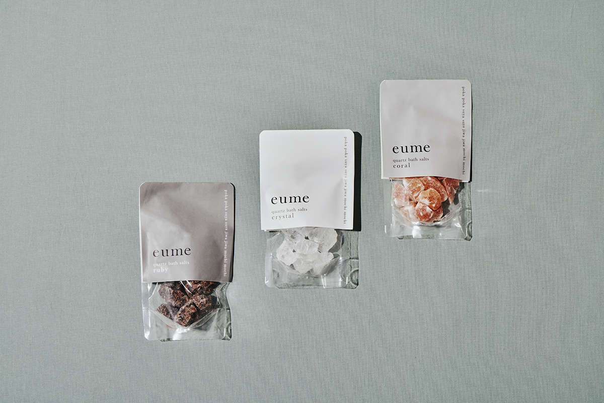 〈コスメキッチン〉eume クォーツバスソルト トライアル 左から、ルビー、クリスタル、コーラル 各980円