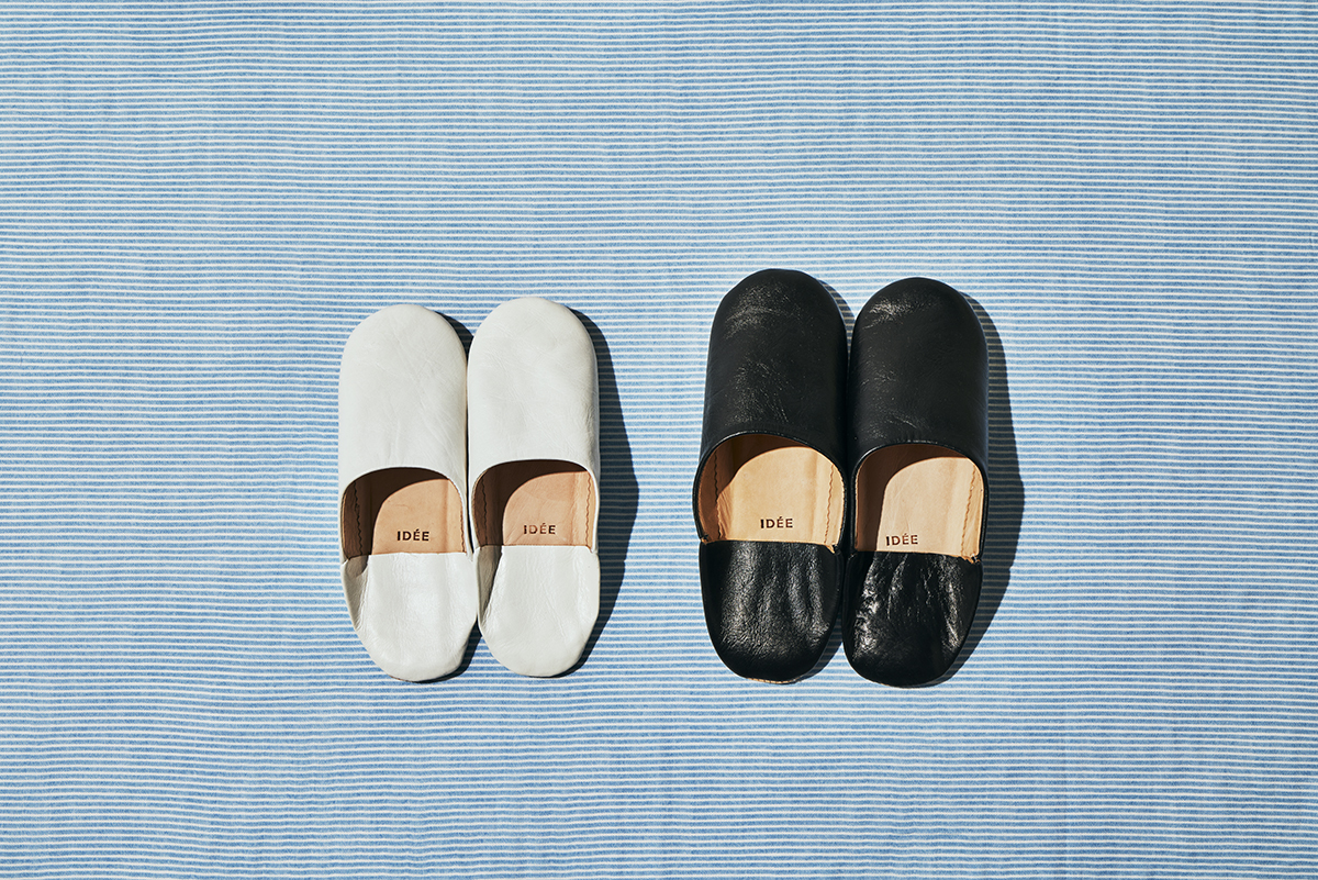 「自分だとつい安物買いしてしまいがちなのがスリッパ。引っ越しを機に新調するなら、履き心地がよく、足を入れた瞬間からフィットする上質なものを」。飽きのこないシンプルな色合いのバブーシュは、部屋のシチュエーションを選ばない。サイズはSとLがある。〈IDÉE SHOP VARIÉTÉ〉渋谷ヒカリエ5Fで販売中。