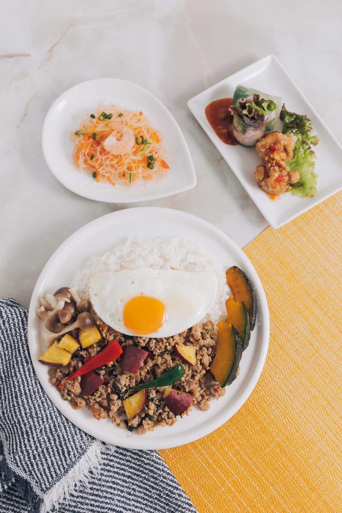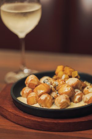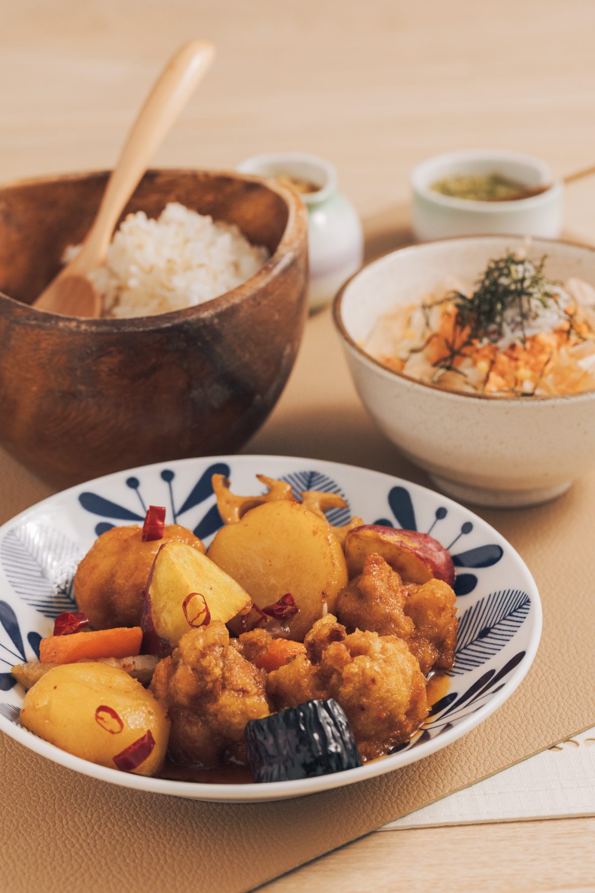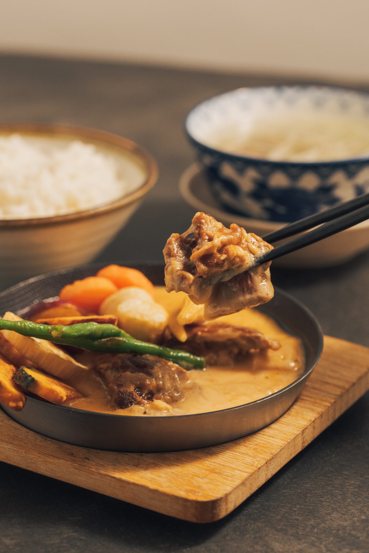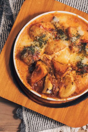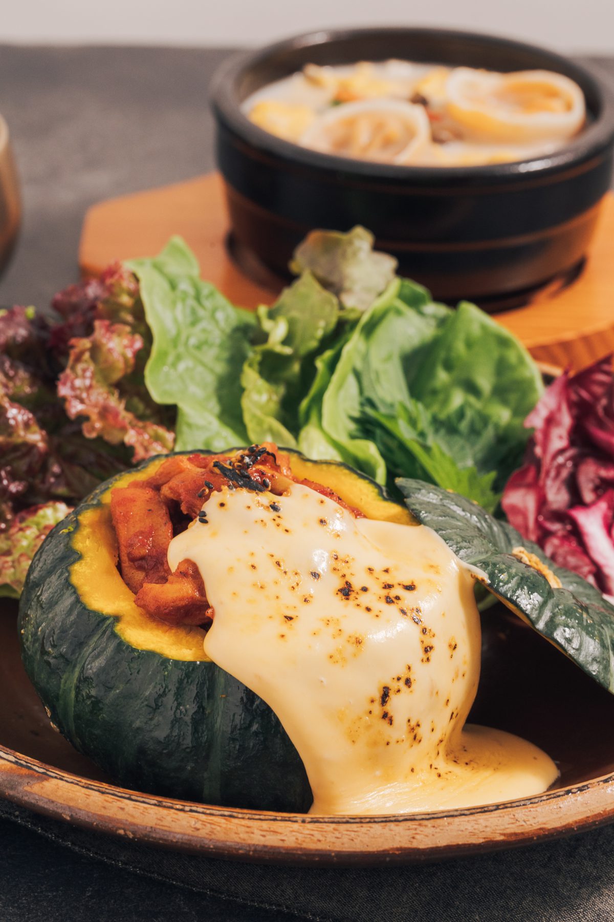 たっぷりのチーズソースが絶妙にマッチした甘辛タッカルビと、肉と野菜とキムチが詰まったマンドゥ(韓国風餃子)・ポカポカと温まるソルロンタン(薬膳牛骨スープ)がセットになっています。このメニューの“撮れ感”ポイントは、なんといっても器ごと食べられるカボチャにたっぷりとかかったチーズが零れ落ちる瞬間!