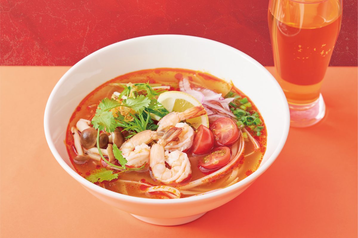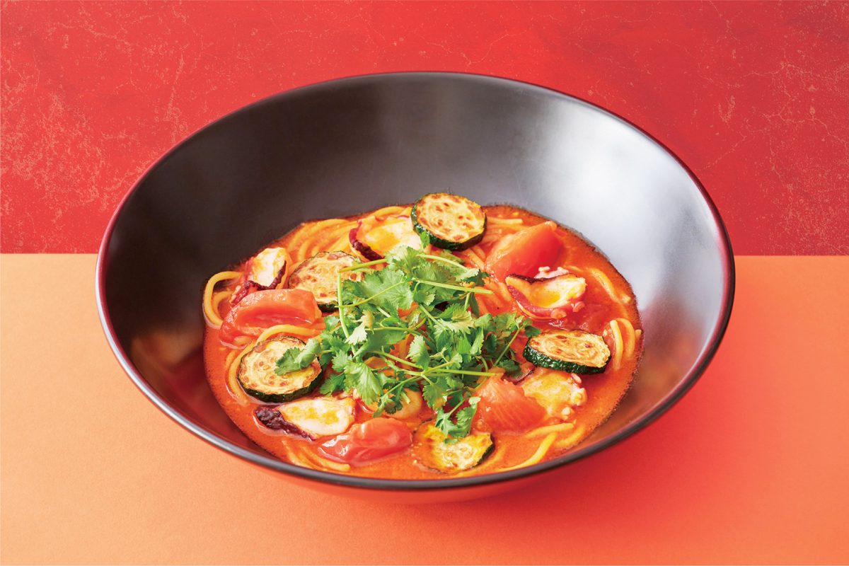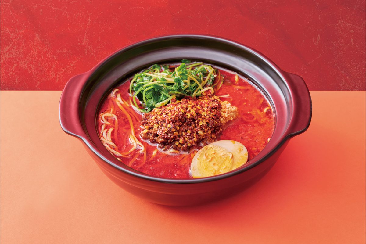 「土鍋マーラー担々麺」は、豚ひき肉や唐辛子、ピーナッツが入った辛肉味噌と、赤々としたスープによる、見た目のインパクトに圧倒される担々麺ですが、その味は麻辣の痺れる辛さがクセになるおいしさ。さっぱりとした豆苗や、味付け卵も楽しめる一品です。