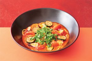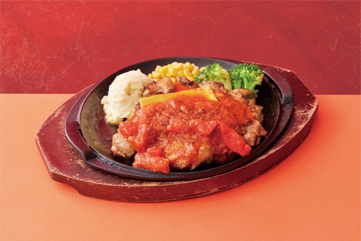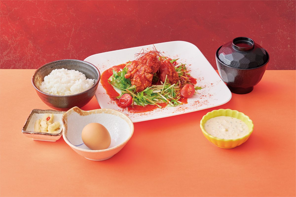 「情熱のチキン南蛮定食」は、宮崎名物のチキン南蛮を、ほんのり辛味の効いた甘酢ベースのトマトチリソースで味付けし、赤が映える一品にアレンジした夏らしい定食です。お好みで自家製タルタルソースをかけても美味しく召し上がれます。