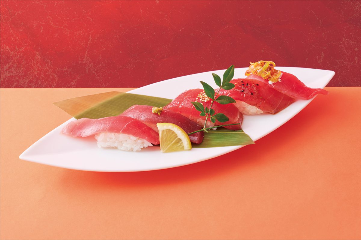 「三崎からの情熱の赤身達」は、三崎で獲れためばちまぐろの赤身をバリエーション豊かに味わえる5貫盛り。写真手前から、ノーマル、塩漬け、醤油漬け、生七味漬け、ラー油のせが盛られており、一皿で異なる5つの赤身の味わいが楽しめます。