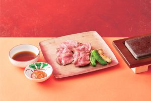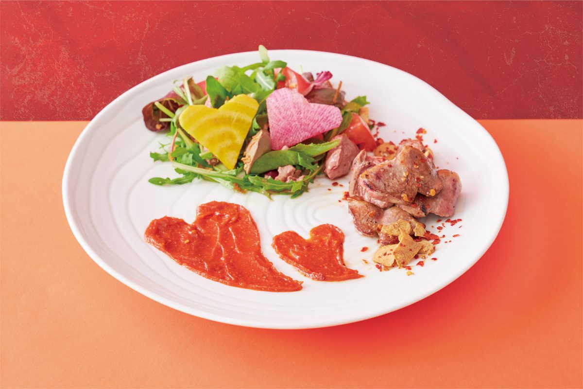 「ハートのガーリック焼きと濃厚レバーとトマトのサラダ」は、低温調理した濃厚なレバーとトマトのサラダに、ハート(ハツ)のガーリック焼きを合わせたスペシャルサラダ。野菜からお肉、ソースまで、色とりどりの“ハート”がちりばめられたハートフルな一皿です。