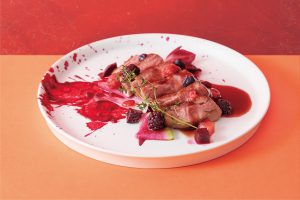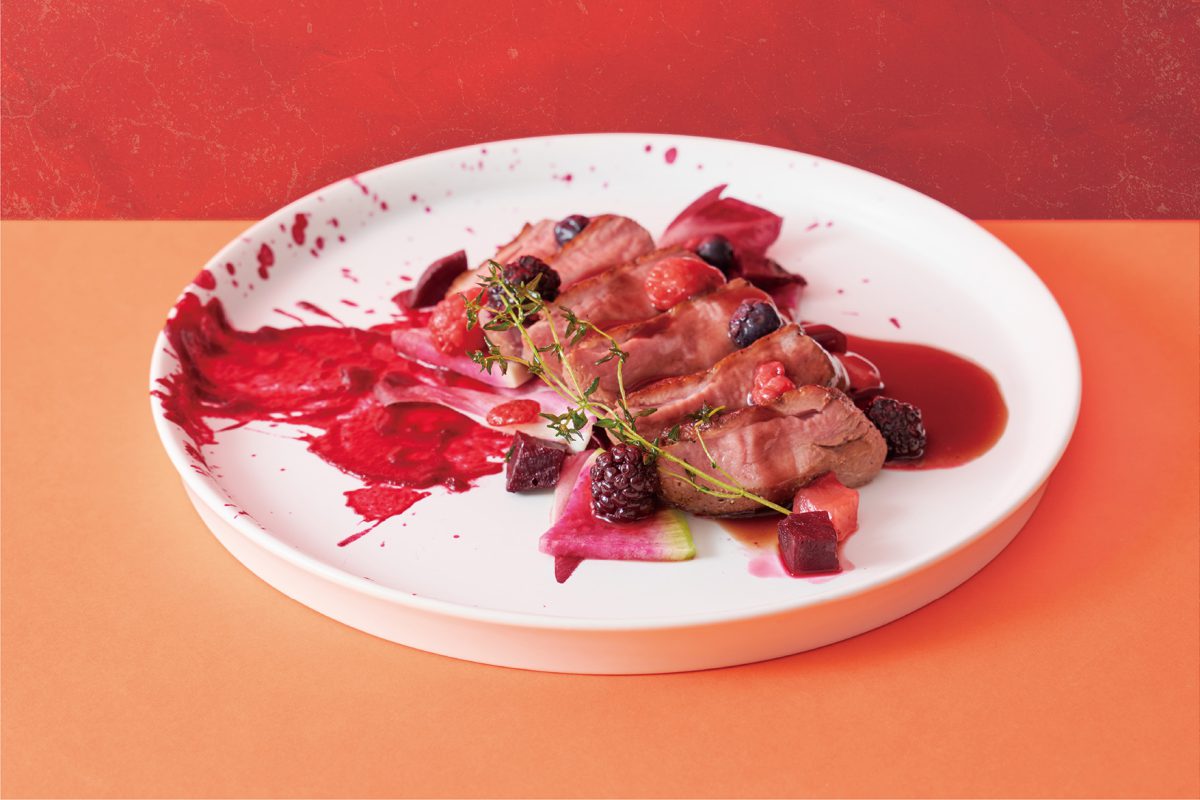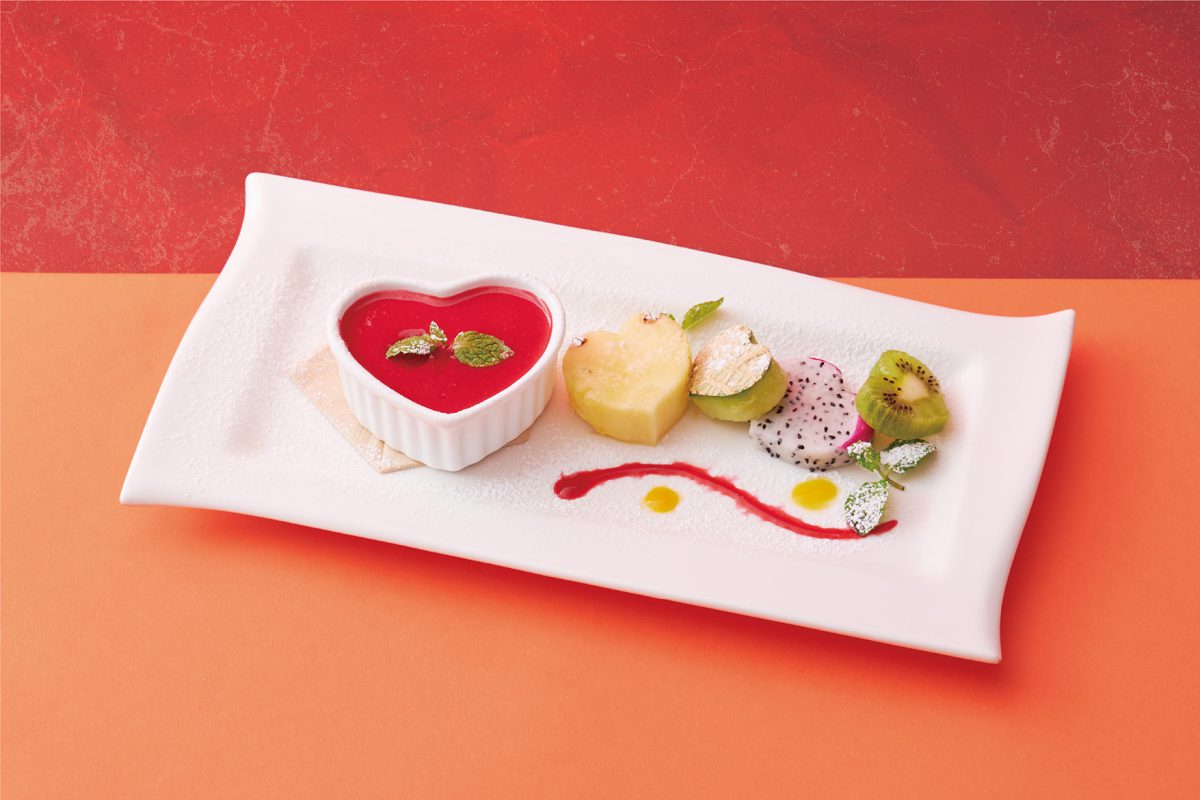 「季節のフルーツとフランの盛り合わせ ~ベリーソースがけ~」は、牛乳と生クリームでシンプルに仕上げた、パンナコッタのようなハート型フランに、フルーツもハート型にカットして盛り合わせた一品。キュートなビジュアルに心奪われる愛のこもったデザートです。