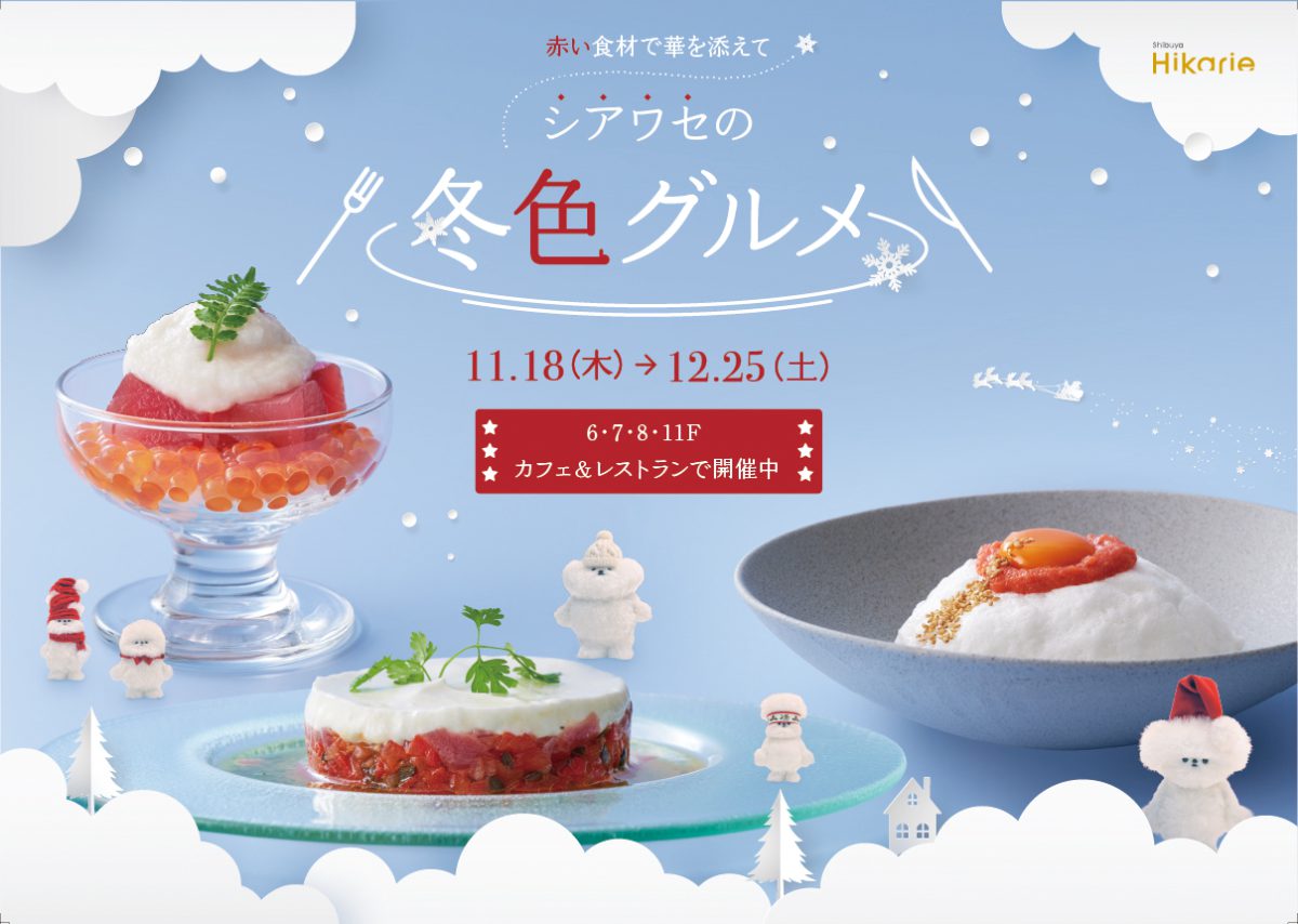 渋谷ヒカリエ6F・7F・8F・11Fのカフェ&レストランで冬のグルメフェアを開催。雪を連想させるような白い食材に、華となる赤い食材をポイントとして添えるなど、この時期らしいカラーのメニューが勢ぞろい。シアワセの冬色グルメを楽しめるのは、もちろん今だけです!