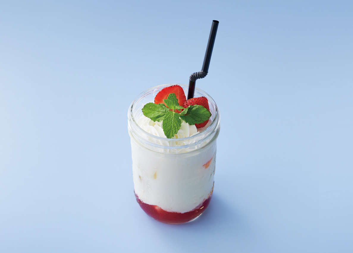 今回のメニューは<ホワイトチョコ豆乳>。ベリーソースの上にホワイトチョコと豆乳を注ぎ、フレッシュないちごとミントを飾ったドリンクです。白と赤のビジュアルもかわいく、冬のスイーツにぴったり!
