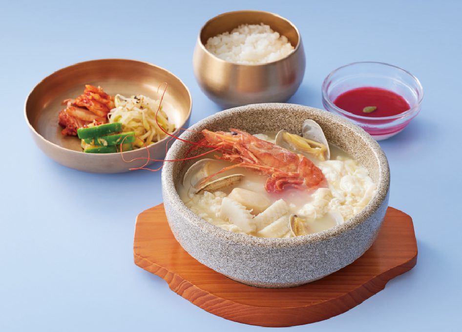 今回のメニュー<海老と帆立の海鮮白スンドゥブチゲ>は、海老、帆立、イカ、アサリなどの魚介の旨味がたっぷり詰まった韓国宮廷料理のひとつ!裏ごしした生アサリから出汁をとっているので、とっても上品な味わいです!