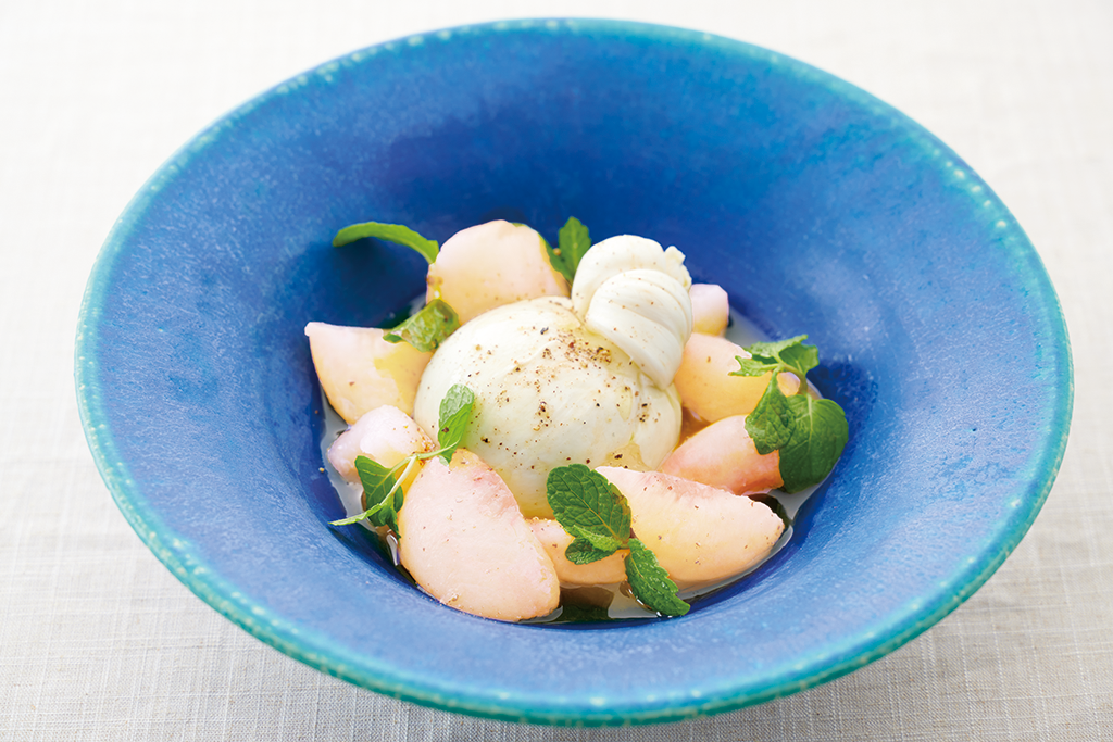 「東京モッツアレラ工房のフレッシュブッラータ・ピスタッキォと桃のカプレーゼ」