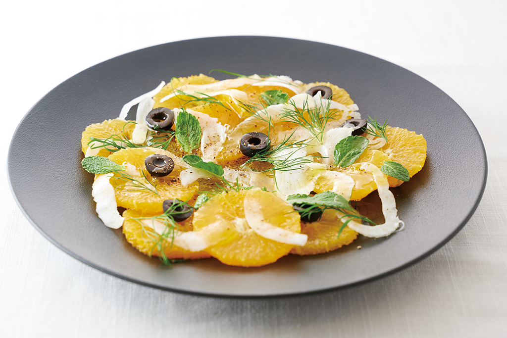 「Insalata di Arance」は、オレンジをふんだんに使った、少し酸味を感じるイタリアの伝統的なフルーツサラダです。アクセントにミント、ディル、フェンネル、ブラックオリーブを散らし、オリーブオイルをかけて仕上げました。