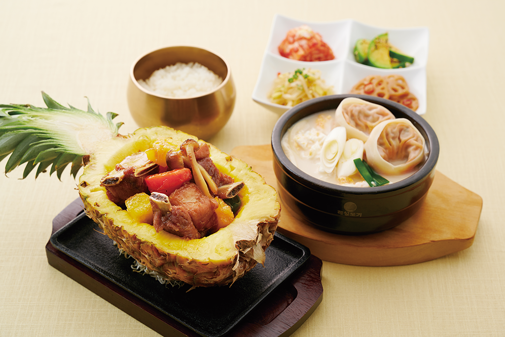 「丸ごとパイナップル!骨付きテジカルビチムとキムチ餃子ソルロンタン」
