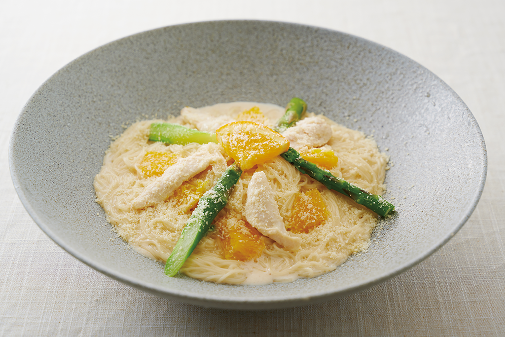「オレンジとアスパラのクリームそうめん」は、オレンジのピールや果肉で香り付けしたクリームスープとそうめんを組み合わせた新感覚のおいしさ。アスパラガスやささみの具材で食べ応えも十分。アクセントに加えたシナモンが絶妙な味わいです。