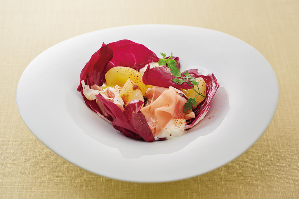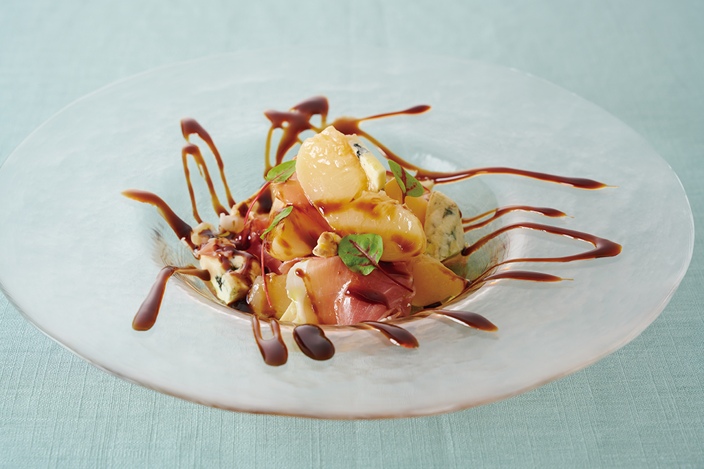 「北海道産モッツァレラチーズと生ハムメロンのカプレーゼ」は、北海道産のミルキーなモッツァレラチーズの旨味、旬のメロンの甘み、生ハムの塩味が織りなす3種の味わいハーモニーが楽しめる絶品メニュー。香り高いハーブが食材のおいしさをさらに引き立ててくれます。