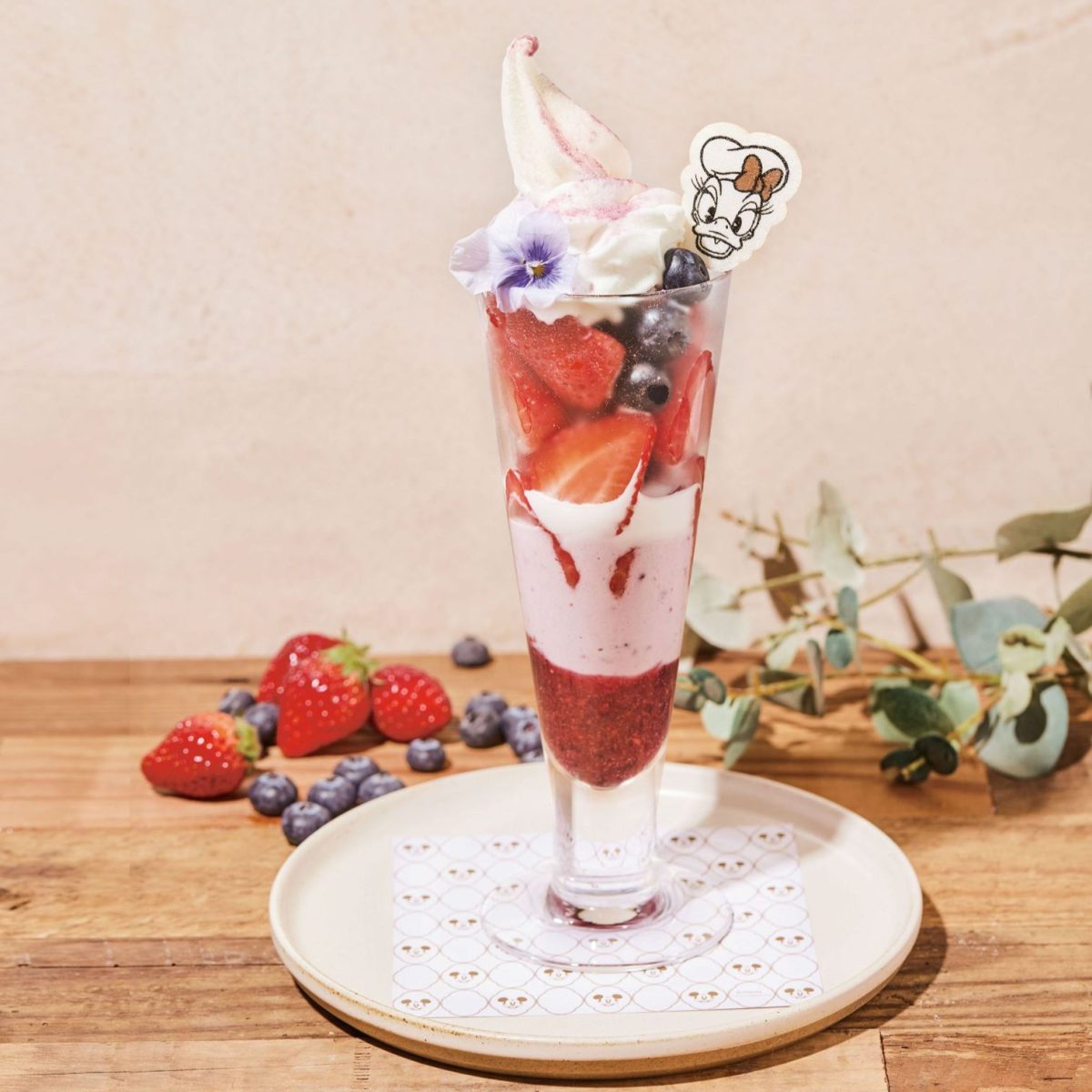 いちごとブルーベリーに濃厚でクリーミーなフローズンヨーグルトとベリーヨーグルトを合わせたライラックカラーパフェ。ひんやり爽やかなフローズンヨーグルトを使ったパフェにはフルーツもたっぷり。デイジーダックをイメージしたエディブルフラワーで気分も上げてくれます。