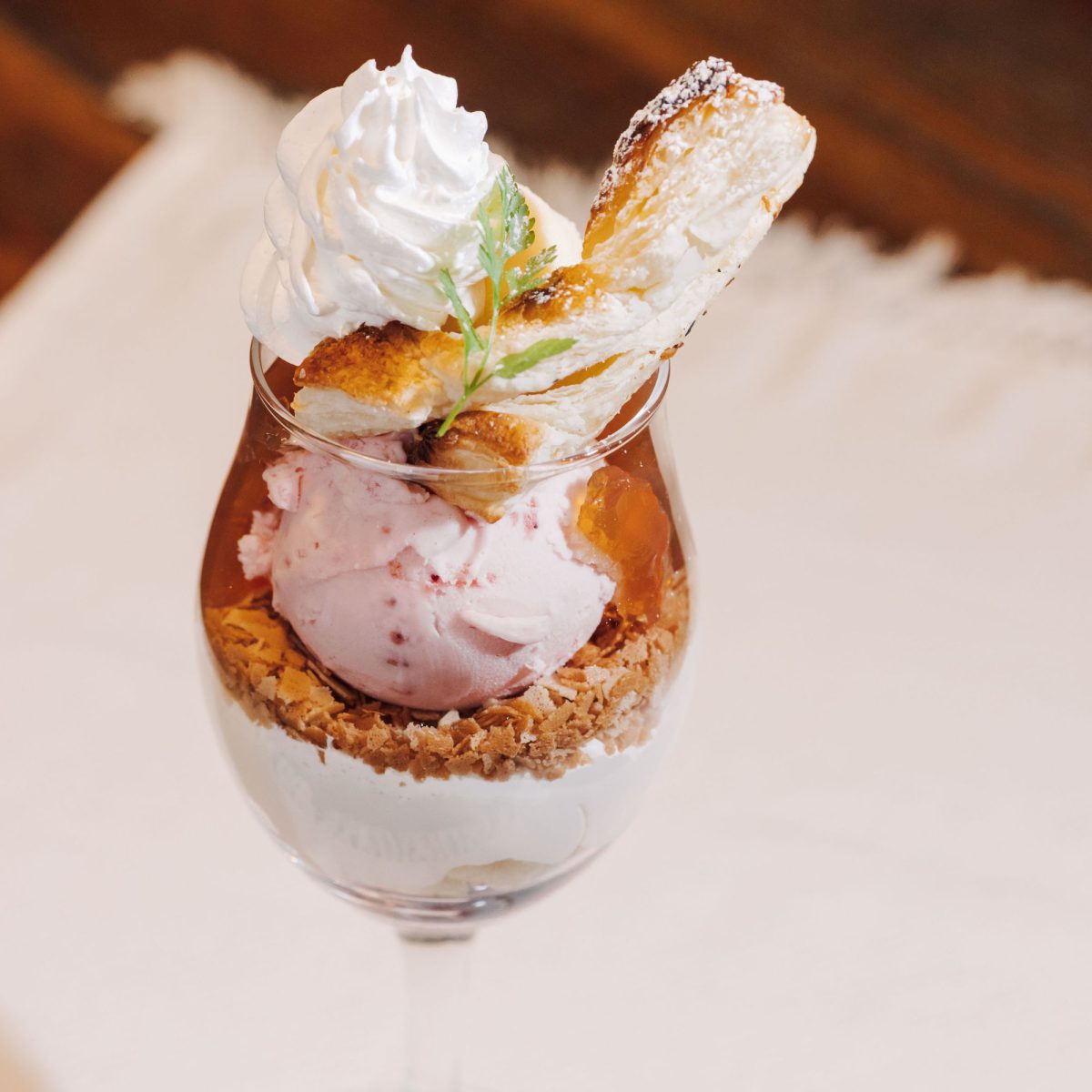 主役のいちごに、香り豊かな紅茶のジュレと、シナモンやナツメグをほんのり効かせた洋梨のコンポートを合わせたパフェ。カスタードと生クリームを混ぜたまろやかなクリームが全体をやさしくまとめ、上品な甘さに仕上がっています。中にはフィアンティーヌを忍ばせ、軽やかな食感をプラス。飾りのパイはディップしても、砕いて混ぜて食べても楽しめます。