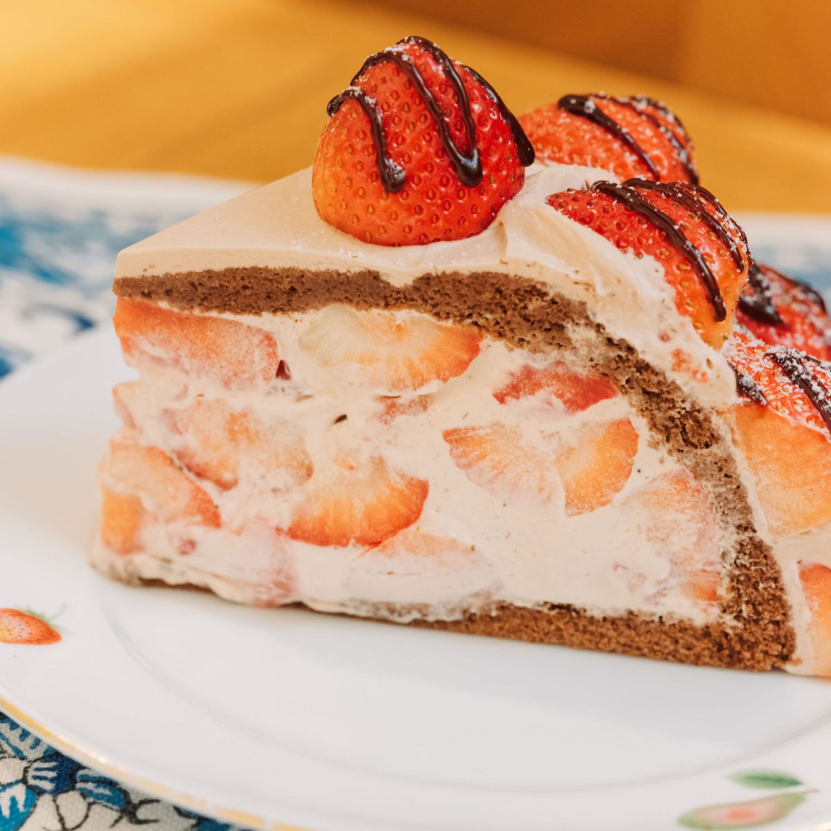 しっとりとしたチョコスポンジにいちごとホイップクリームをたっぷり重ねた、フルーツが主役の贅沢なズコット。果実の酸味とチョコの深い甘みが絶妙にマッチし、満足感あふれる一皿。どこから食べてもいちごの香りとみずみずしさが広がります。