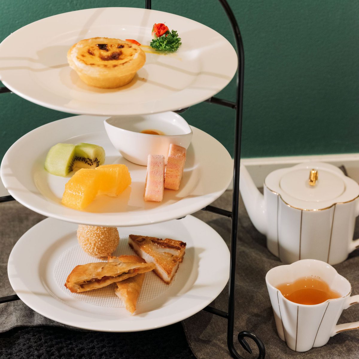 点心と薬膳茶が同時に楽しめる贅沢なアフタヌーンティー。エッグタルトや季節のフルーツなどのスイーツに加え、胡麻団子や春巻きなど和洋中の味を少しずつ味わえる充実の内容。ドリンクは中国茶・薬膳茶・ソフトドリンクからお好きなものをお選びいただけます。
