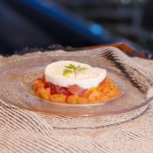 新鮮なマグロを使用したスペイン風タルタル。スペインで親しまれている、牛乳をベースに仕立てた特製タルタルで、見た目は濃厚ながら味わいはさっぱり。オリーブオイルや周りのソースと混ぜて楽しむ、前菜にぴったりの一皿です。