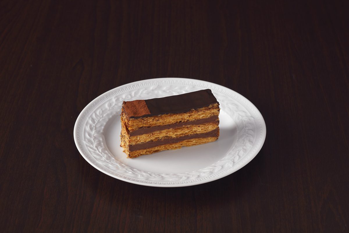 サクサクのパイに濃厚なチョコレートカスタードクリームをサンドしたミルフィーユ。香ばしいパイの風味とビターなチョコレートのコクが調和した、上品な味わいです。