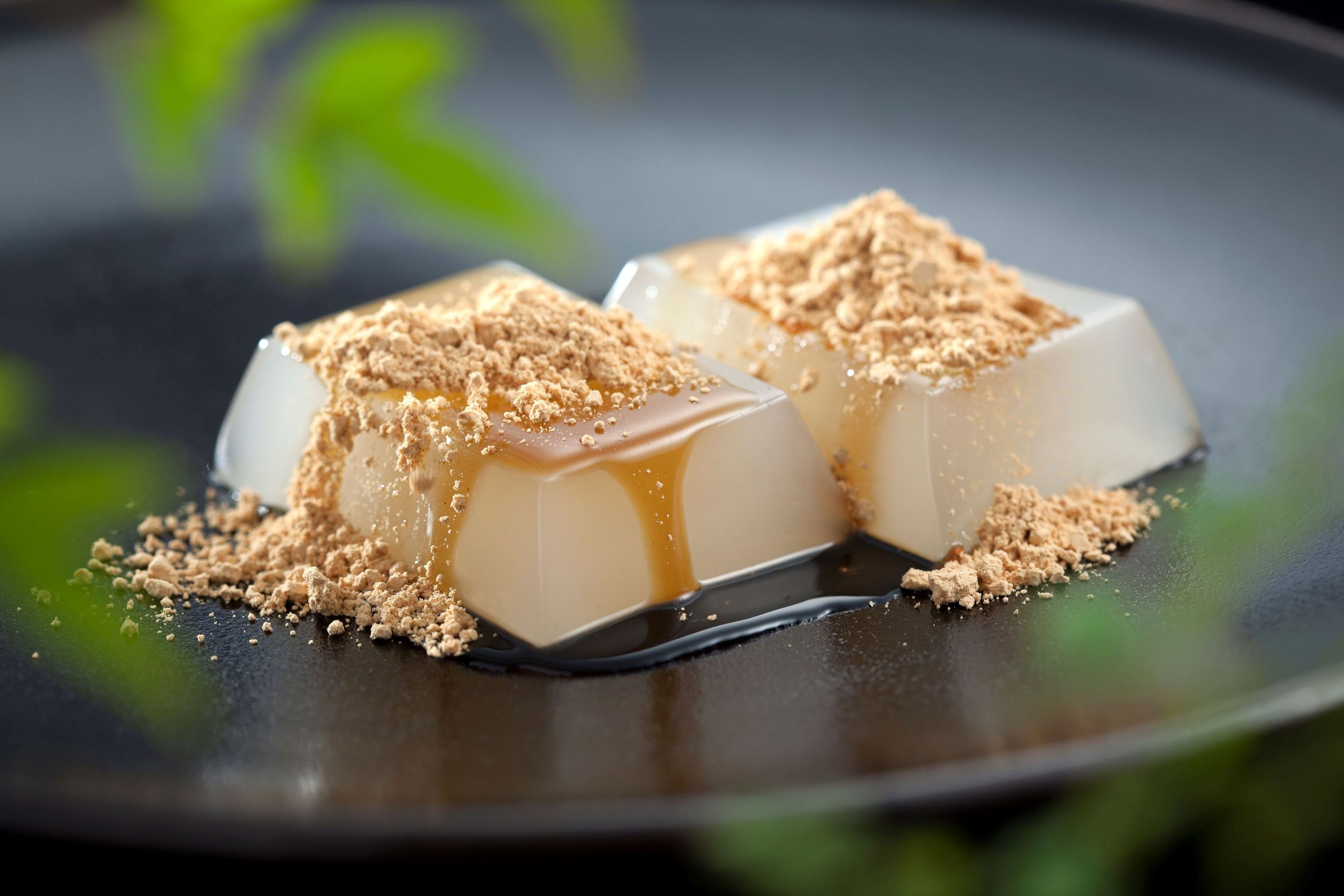 野⽣の葛の根から採る本葛粉を使⽤したくず餅。滑らかな⾆ざわりと、⾃然の素材だけが持つくせのない⾹りと上品な味わいが特⻑です。沖縄⿊糖を使⽤した⿊みつときなこを仕上げにかけて、お好みの⽢さで楽しめます。少し冷やすとさらにおいしく召し上がれます。