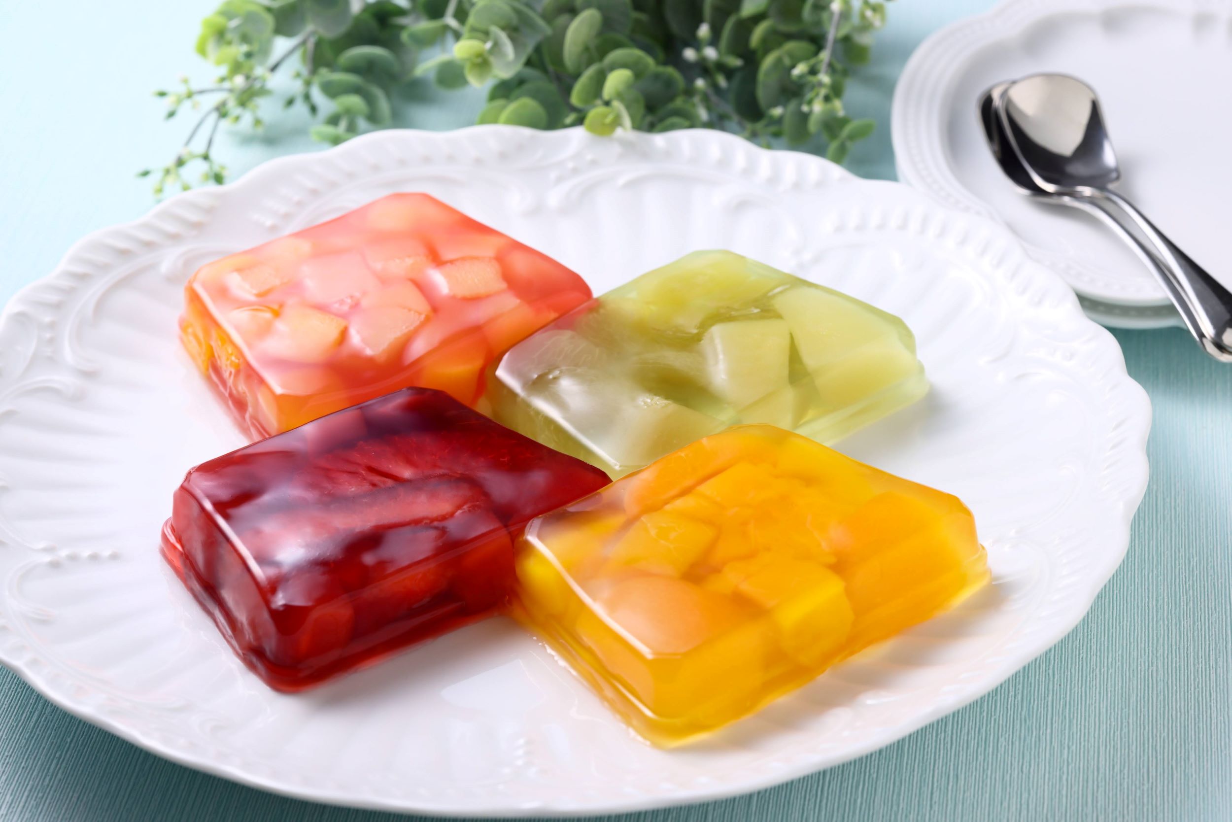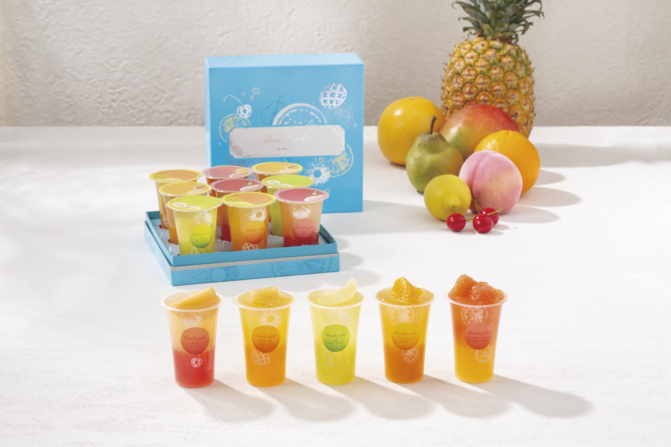 ふたつのフルーツを2 層に重ね合わせた、⾊彩鮮やかなフルーツジュレ。ひと⼝、ふた⼝と⾷べ進むうちに、2 層に分かれていたフルーツがミックスされ、新しい⾵味や⾷感を楽しめます。