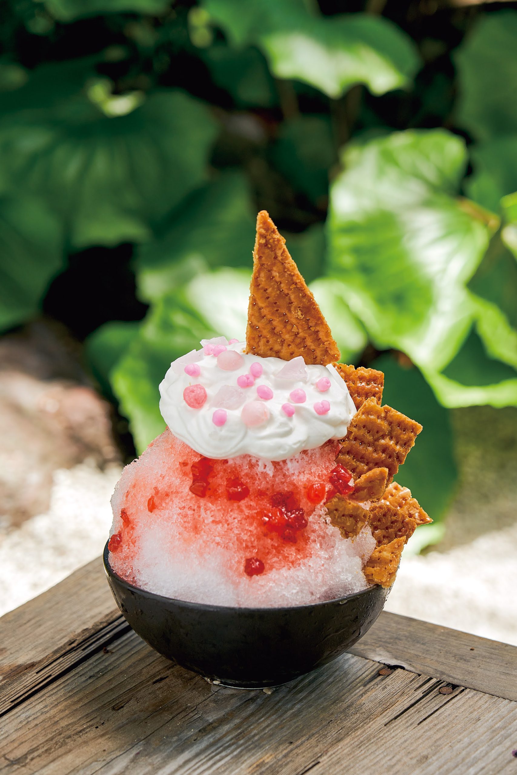 ミルフィーユをイメージし、サクサクのパイ⽣地を使ったいちご味の氷菓。エスプーマ仕⽴てのクリーム、かき氷の中にいちごグラッセといちごのアイスクリームが⼊っています。⽢酸っぱいいちごのシロップと、練乳⼊りの⽣クリームがマッチする、季節の味を楽しめます。