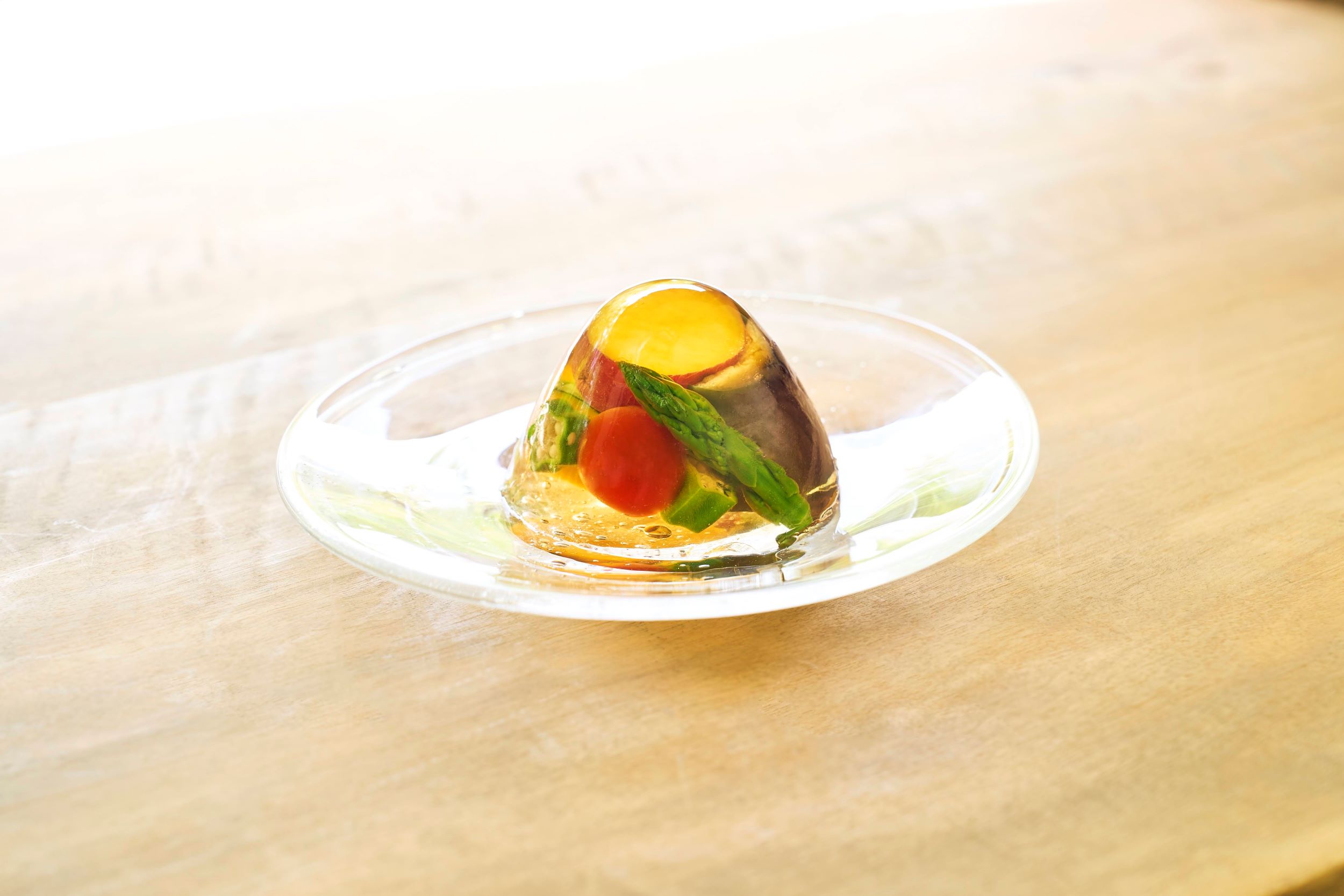 オクラやアスパラ、カボチャ、ミニトマトなど⾊鮮やかな夏野菜をゼリー寄せにした、涼を感じる⼀品。暑いこれからの季節に、旬の野菜をデザート感覚でさっぱりと⾷べられます。
